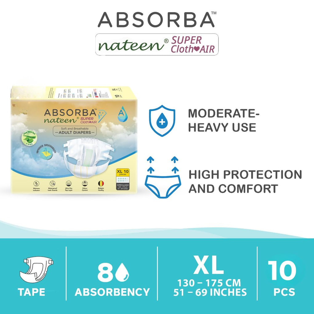 Absorba Nateen SUPER CLOTHAIR Adult Diapers are for moderate to heavy usage. Suitable for day and night.
