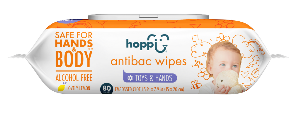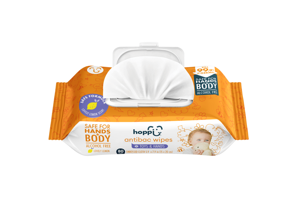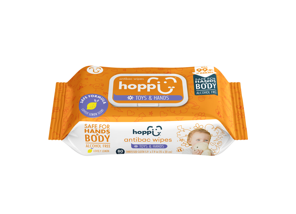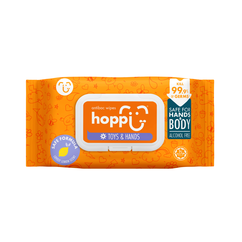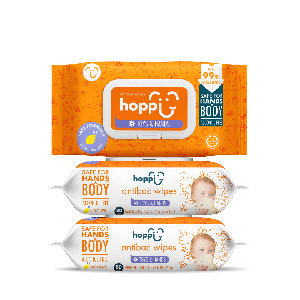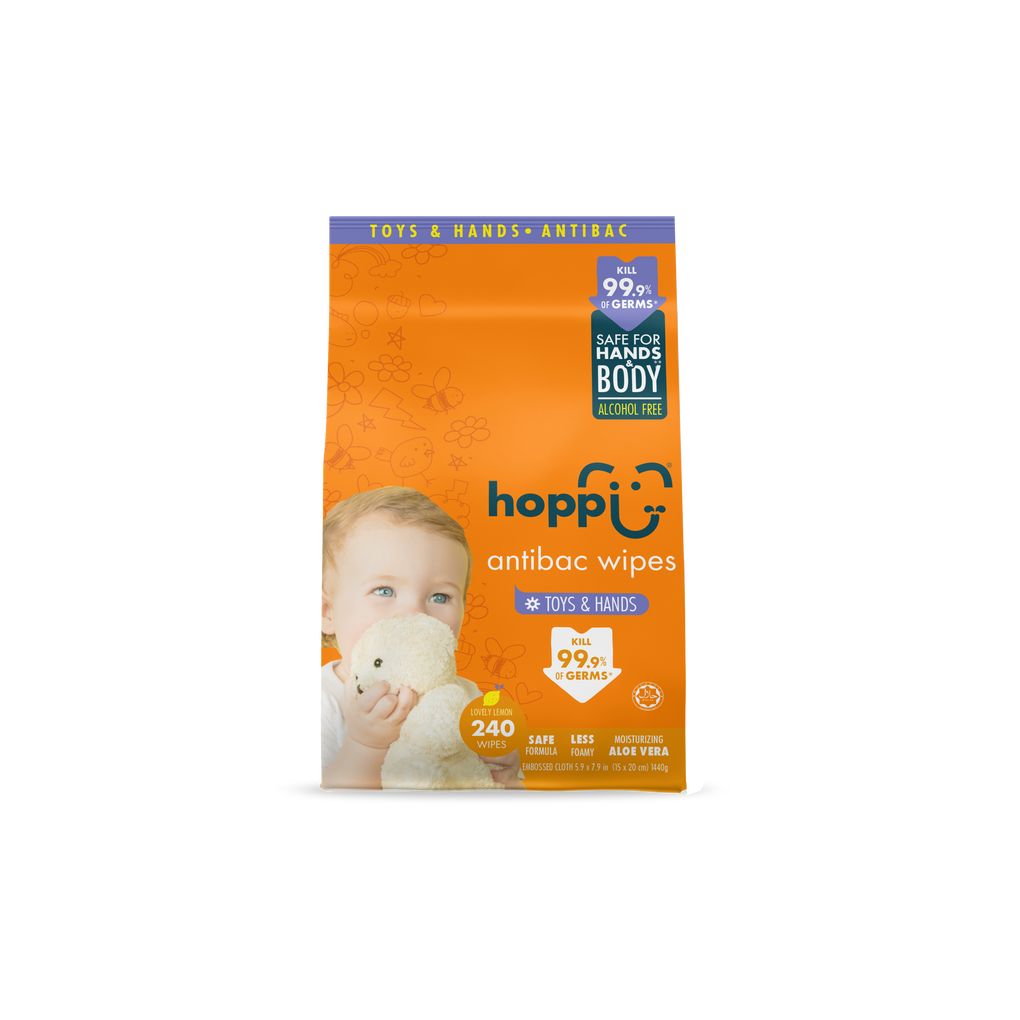 Hoppi™ Baby Antibacterial Wipes swiftly cleanses and protects surfaces against 99.9% of germs. It is alcohol-free and is safe to be used on skin, baby toys, and surrounding surfaces.