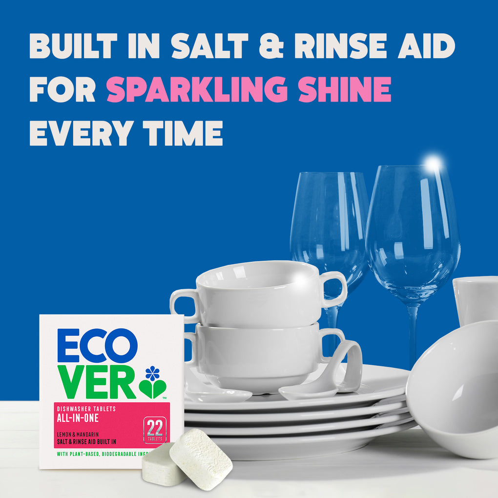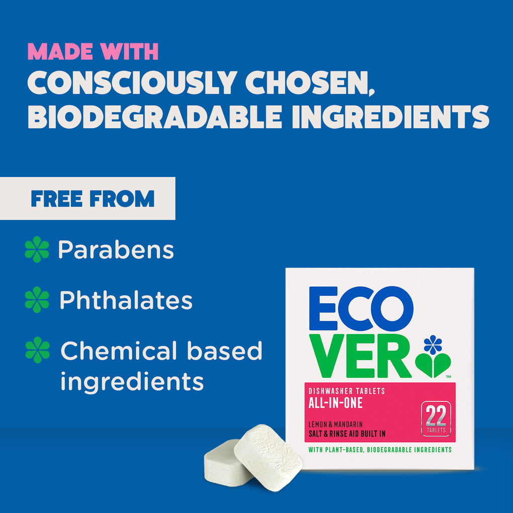 Our dishwasher tablets unleash the power of biodegradable plant-based ingredients to leave your dishes squeaky clean.