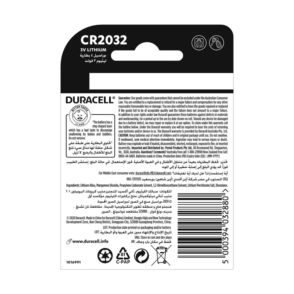 Duracell Specialty CR2032 lithium coin batteries are made with high-purity lithium and are the longest lasting* (vs. other retail CR2032 Lithium coins in Australia based on Service Output IEC standard test.) for your devices.