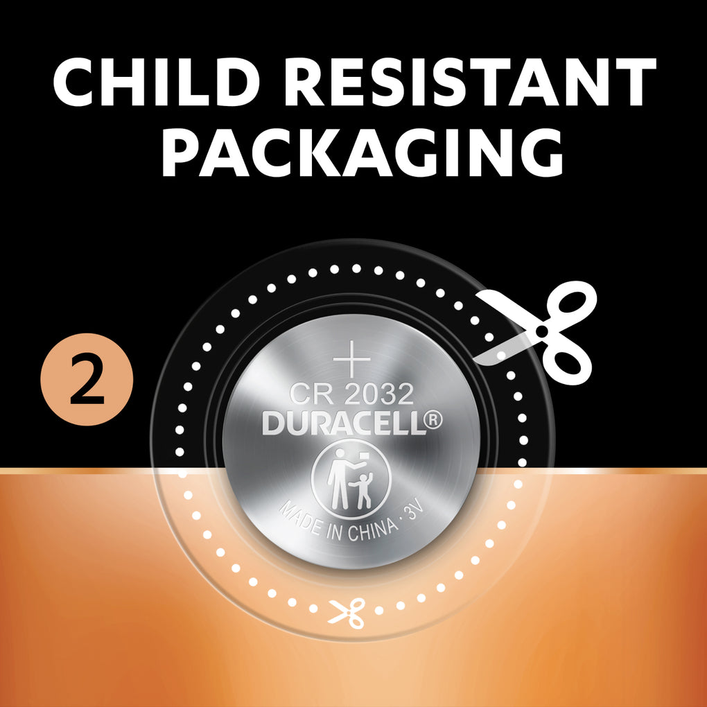 Duracell's CR2032 lithium coin batteries also come with other child-secure features like child-resistant packaging with double blister that is difficult for young children to open with bare hands. Also, child safety warning is embossed on each battery and printed on the packaging to remind parents to keep the batteries out of reach of children.