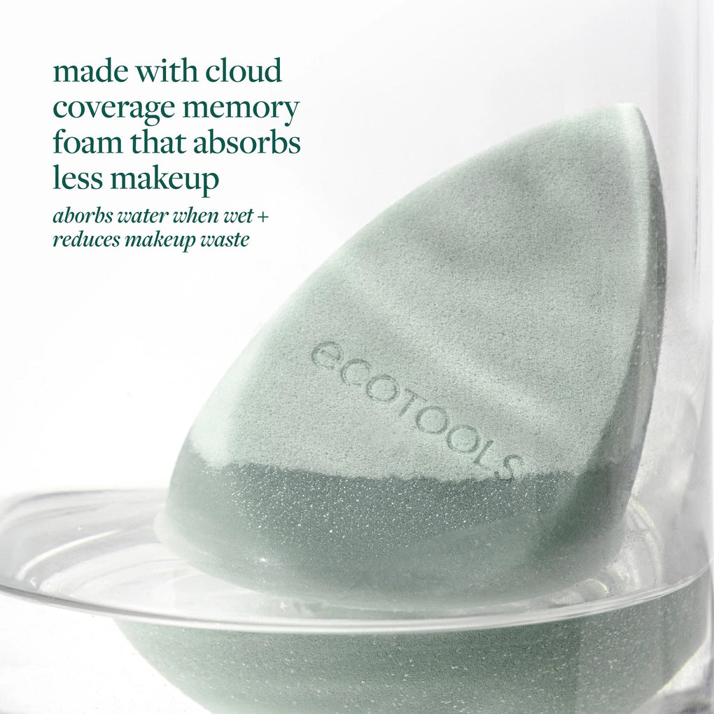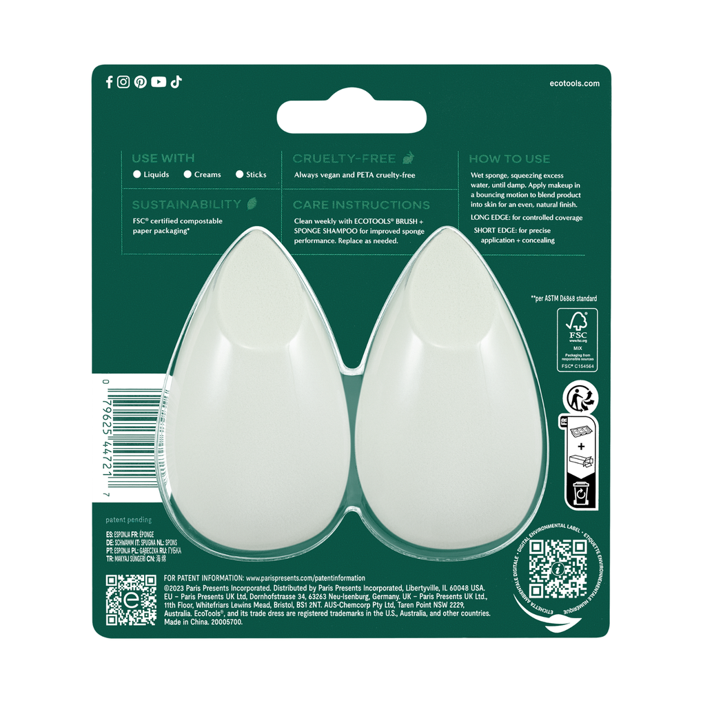 The EcoTools Blurring Blender Makeup Sponge Duo features an ultra-soft, bouncy foam that reduces makeup absorbency for buildable, even coverage. Our makeup blending sponge works best damp with liquid, cream, and stick foundation formulations for a natural finish. This light and bouncy blender sponge was created with cloud coverage memory foam to absorb less makeup and reduce waste. It also features 2 sides for custom coverage. Use the long edge of the foundation sponge for controlled coverage and the short edge for precise application and concealing. Superior performance made sustainable. As with all our EcoTools products, this makeup blending sponge is 100% cruelty-free, latex-free, and vegan. The Blurring Blender Sponge is easy to clean with our EcoTools Brush + Sponge Shampoo for improved sponge performance.