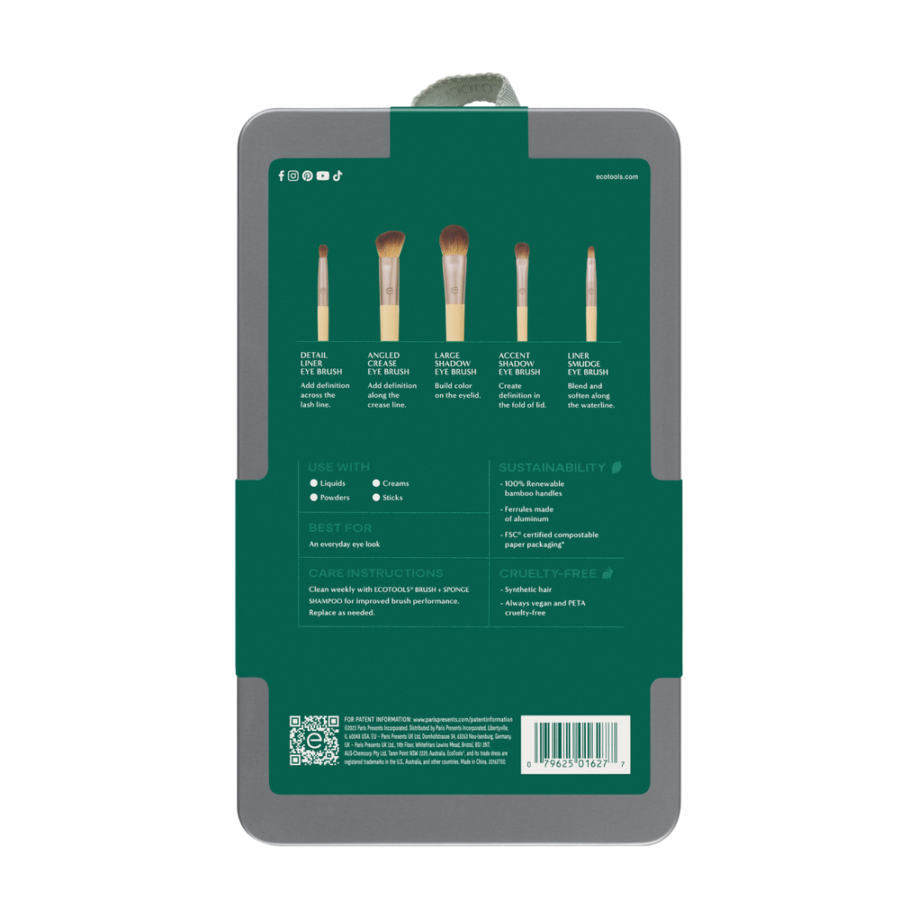 The EcoTools Daily Defined Eye Brush Set brings you 5 eco-friendly, essential makeup brushes for creating the perfect eye look, from liner to shadow. The makeup brush set includes the Detail Liner Eye Brush, Angled Crease Eye Brush, Large Shadow Eye Brush, Accent Shadow Eye Brush, and Liner Smudge Eye Brush. These eye makeup brushes are best used with liquid, cream, powder and stick eyeshadows and liners. Superior performance made sustainable. Our makeup brushes are made with 100% renewable bamboo handles, aluminum ferrules, and soft, synthetic brush hair. As with all our EcoTools products, this brush set is 100% cruelty-free and vegan. The Daily Defined Eye Brush Set is easy to clean with our EcoTools Brush + Sponge Shampoo for improved brush performance.