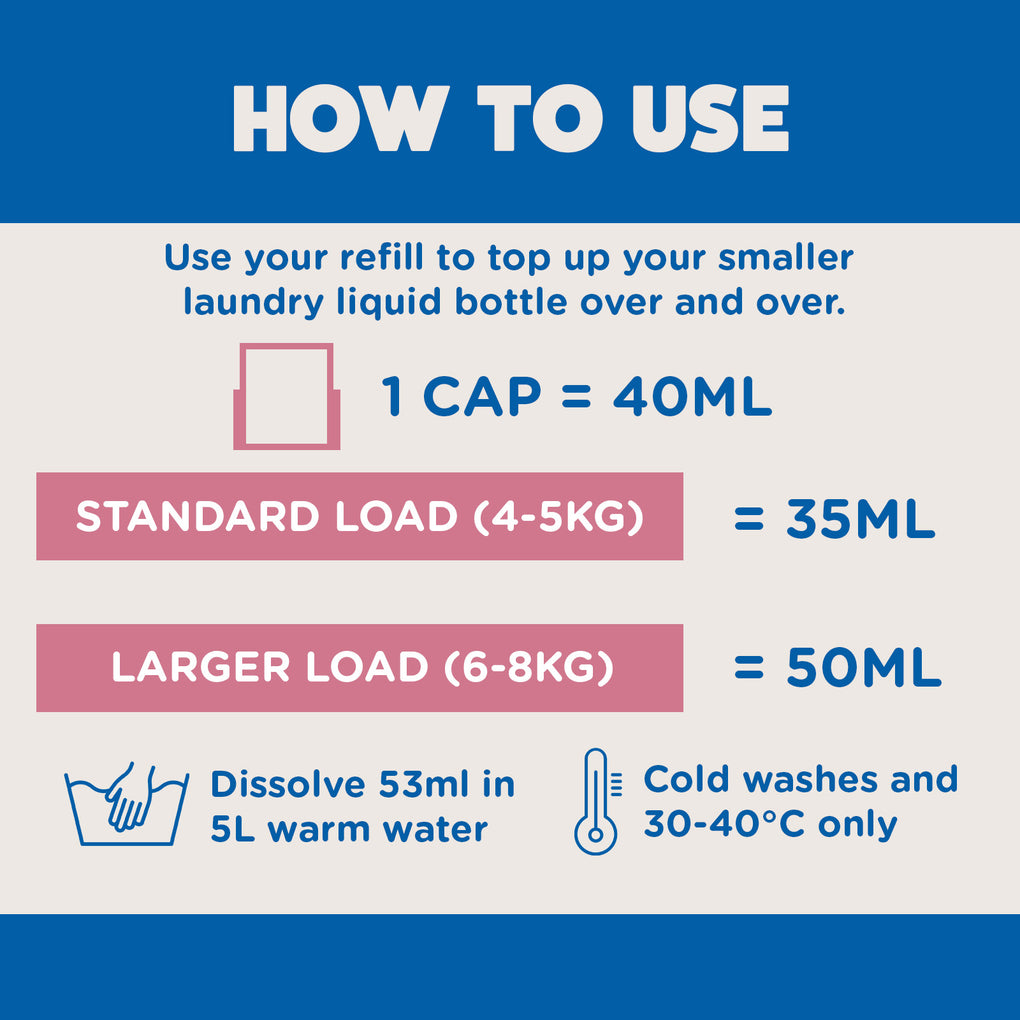 Suitable for all delicate textiles, including wool and silk. Don’t pour directly onto your laundry. Always follow label and machine instructions. Suitable for cold washes and 30-40°C. Flame-retardant finishes: never soak or wash above 50°C.