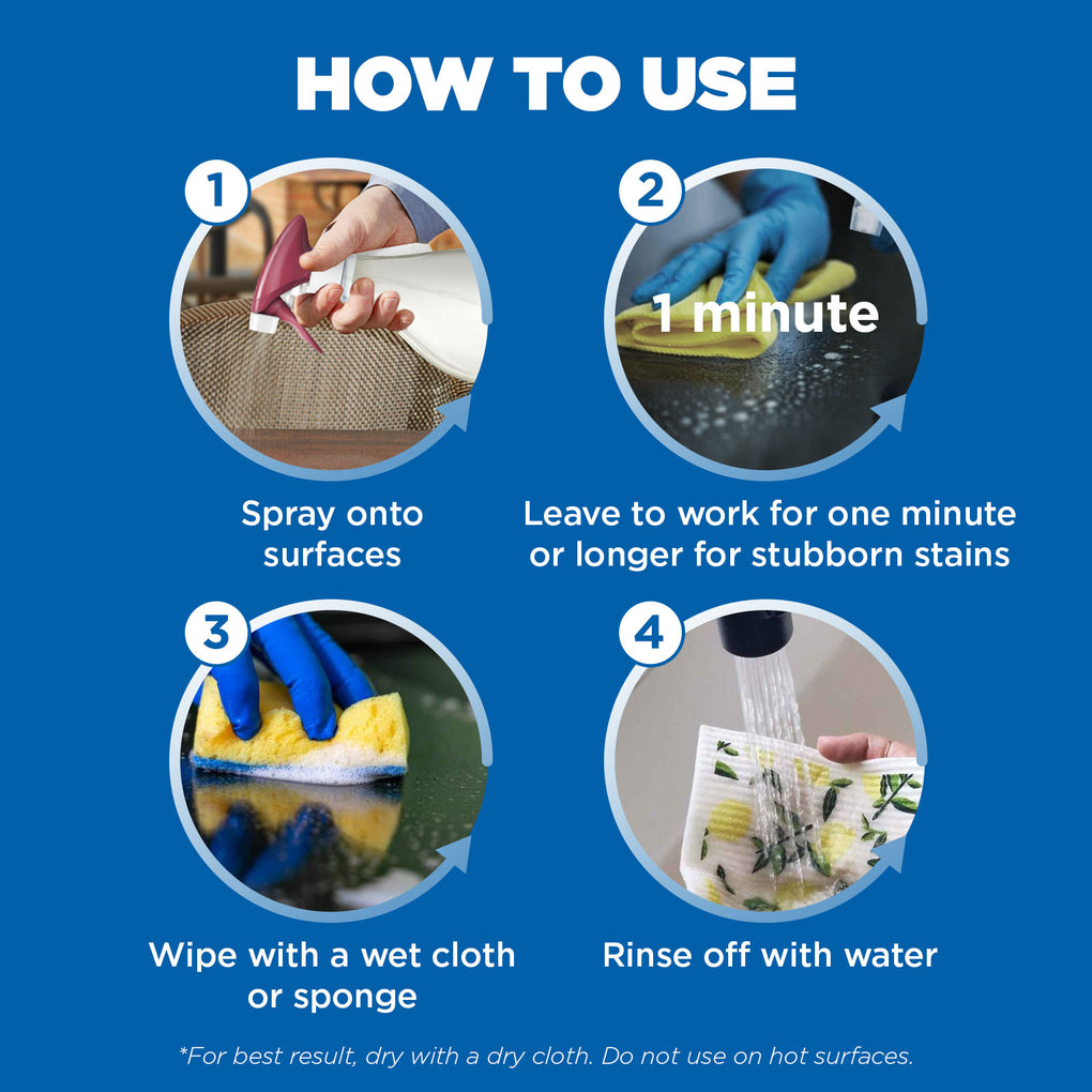 Oven & Hobs: Spray onto surfaces. Leave to work for one minute, leave longer for more stubborn stains. Wipe with a wet cloth or sponge. Rinse off with water. For best result, dry with a dry cloth. Do not use on hot surfaces.