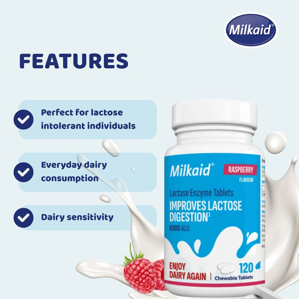 Milkaid® Tablets contain lactase enzyme and are raspberry flavoured chewable tablets.