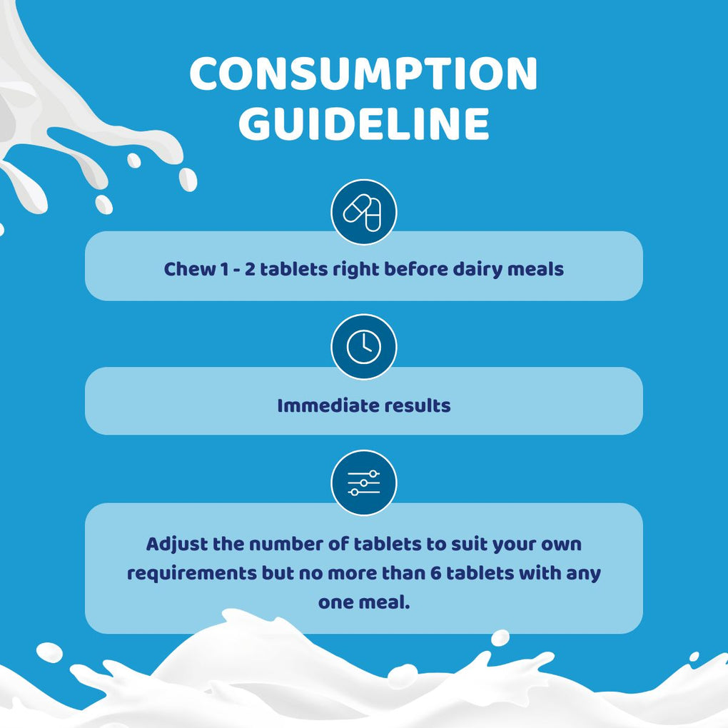 Each tablet contains lactase 3000 ALU and is free from artificial flavours, gluten, yeast or lactose.