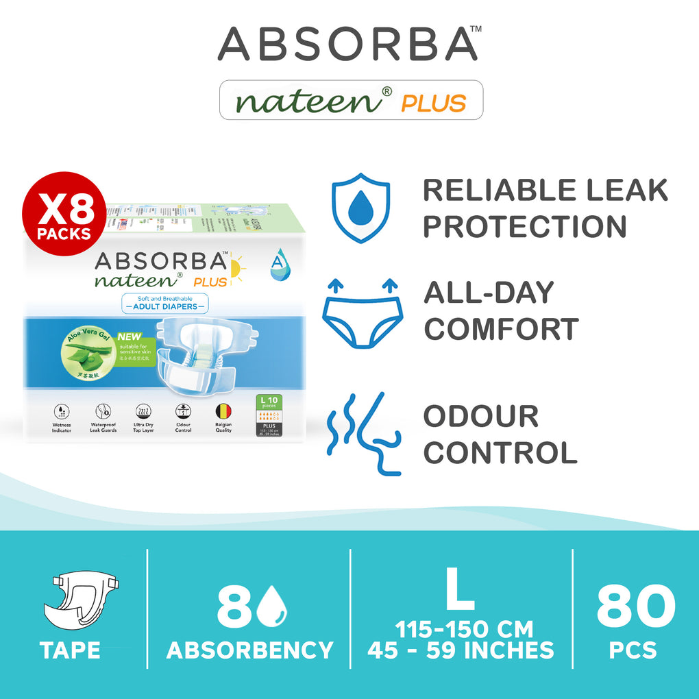 Absorba Nateen Adult Diapers are premium Belgium-Quality incontinent diapers that provides you with multi-functional features and high absorbency performance.