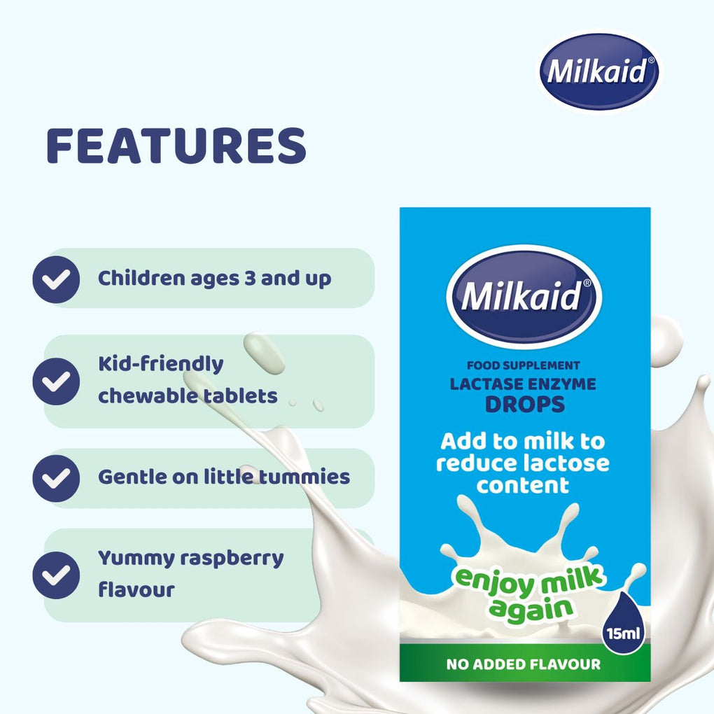 Milkaid® Drops contain lactase enzyme, a safe natural enzyme that is usually found in the digestive system. It works by breaking down the complex milk sugar lactose, into two more easily digestible sugars – glucose and galactose. You can now enjoy milk and dairy foods again, without upset.