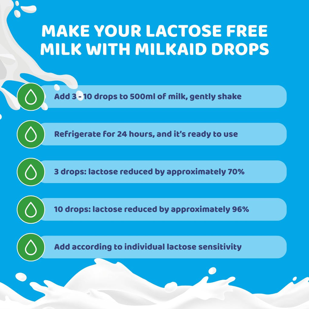 Simply add three drops of Milkaid® lactase enzyme to a pint of milk, gently shake, refrigerate for 24 hours and it is ready to use in cooking, beverages and cereals, hot or cold.