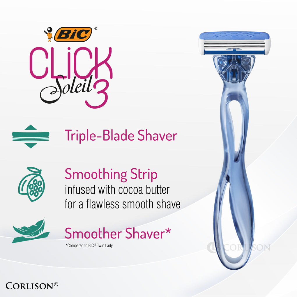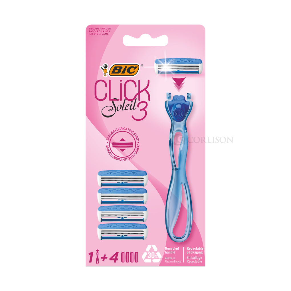 BIC Click 3 Soleil women’s shaver kit with 1 handle made of 30% recycled plastic and 4 blade cartridges in recyclable packaging. An all-in-one triple-blade shaver for a flawlessly smooth shave with a pivoting head for added control. Easy-click replacement cartridges have a soothing moisture strip infused with cocoa butter. Curved blue handle designed for controlled handling, even when wet.