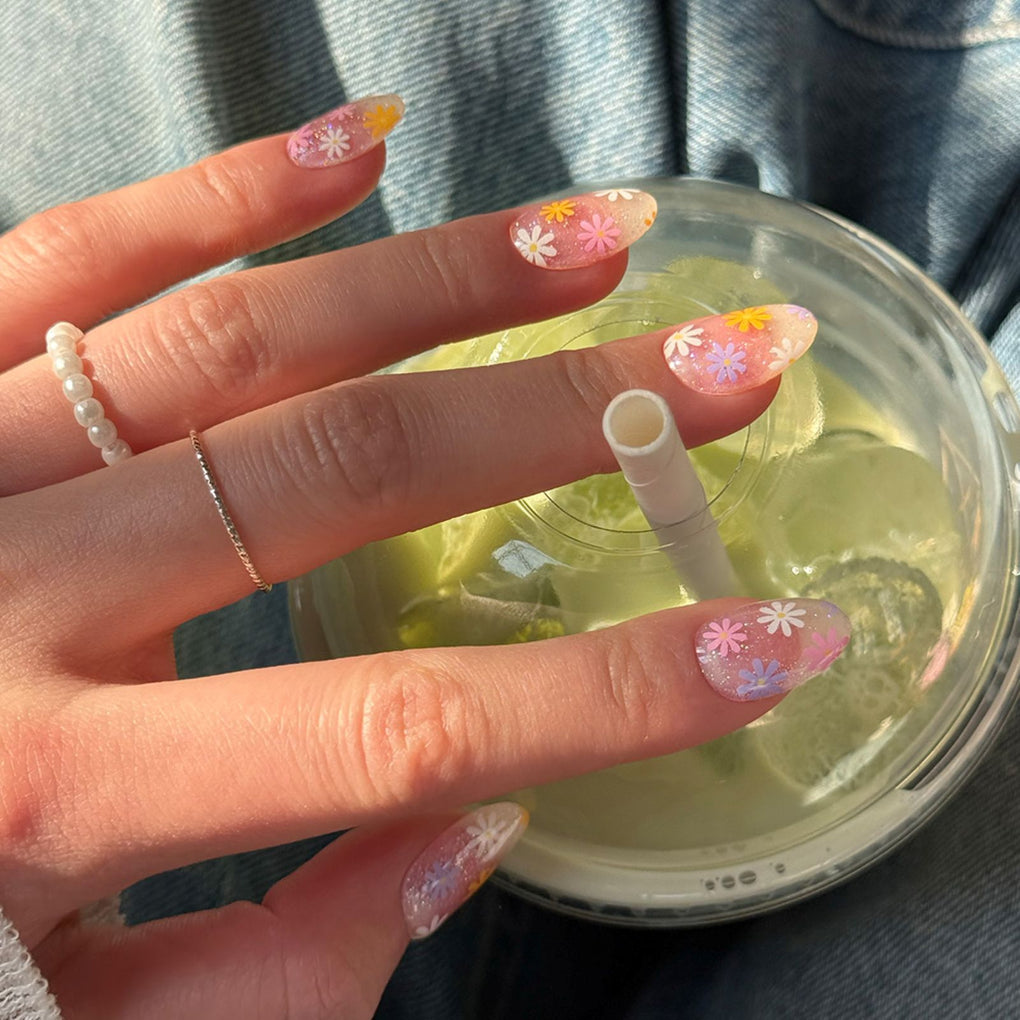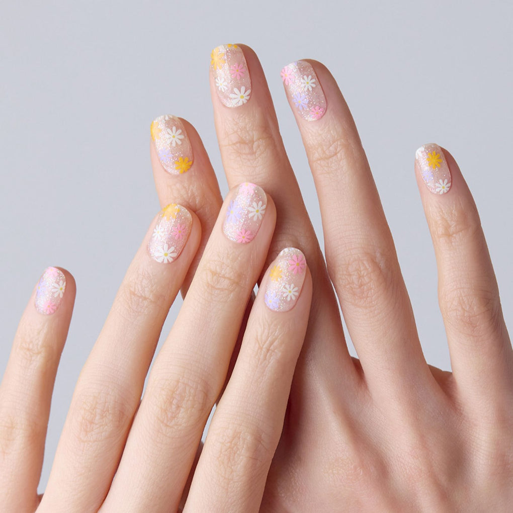 A vibrant daisy nail design that blooms under the sparkling sunlight! The playful hand-drawn daisies in pink, yellow, and purple pop against an iridescent opal film glitter base, shifting colors beautifully with every angle. This lively, eye-catching design captures the cheerful energy of spring, bringing a fresh and whimsical touch to your fingertips.
