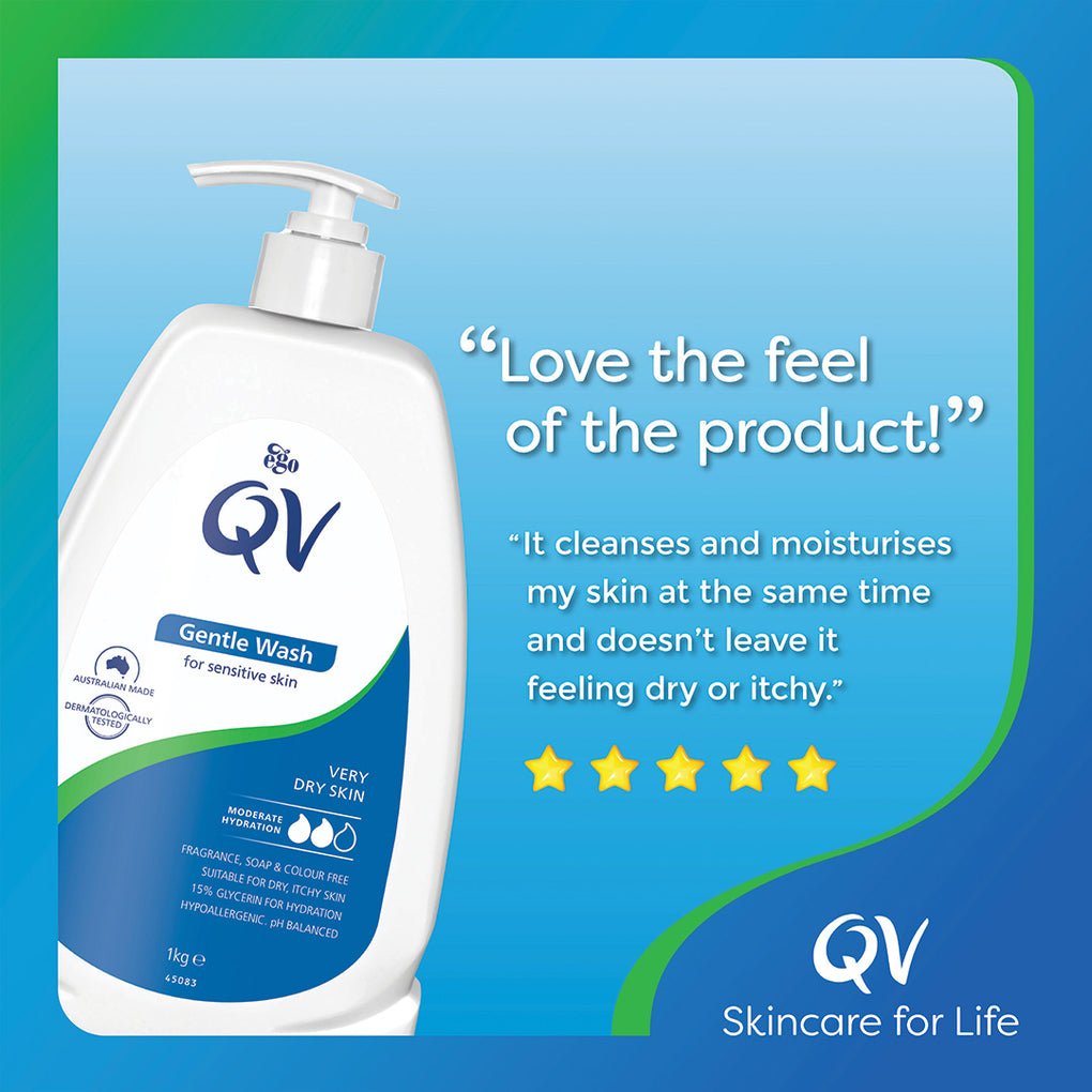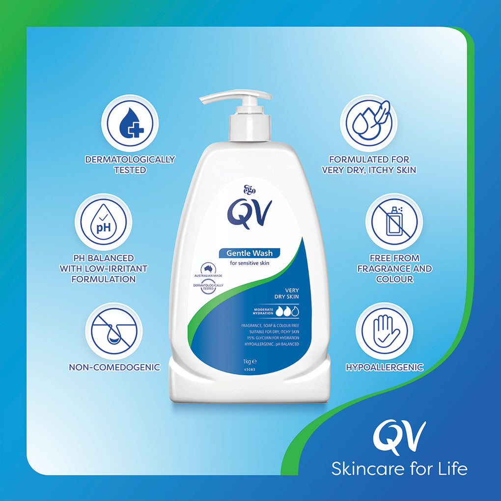 QV Gentle Wash is designed for dry or sensitive skin. It works to help maintain hydration during cleansing so skin is left clean and feeling soft.
