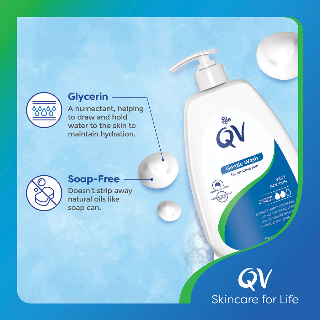 QV Gentle Wash is designed for dry or sensitive skin. It works to help maintain hydration during cleansing so skin is left clean and feeling soft.