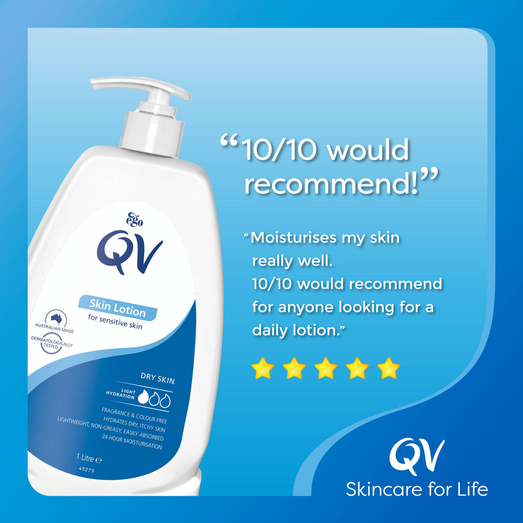 QV Skin Lotion replenishes and soothes dry skin. For best results apply after your bath or shower.