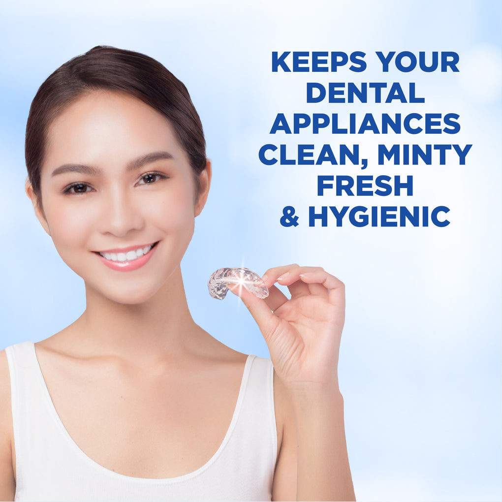 These tablets are effective and gentle on most removable dental appliances. It can be used daily to deeply cleanse dental appliances in 3 minutes, killing 99.99% of odour causing bacteria and effectively removing stains, discoloration, plaque and tartar.