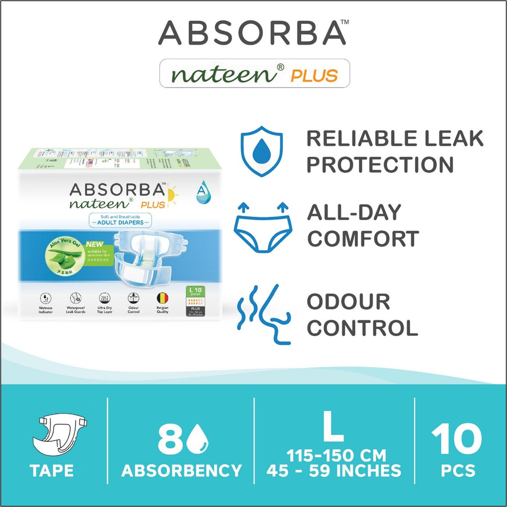 Absorba Nateen Adult Diapers are premium Belgium-Quality incontinent diapers that provides you with multi-functional features and high absorbency performance.