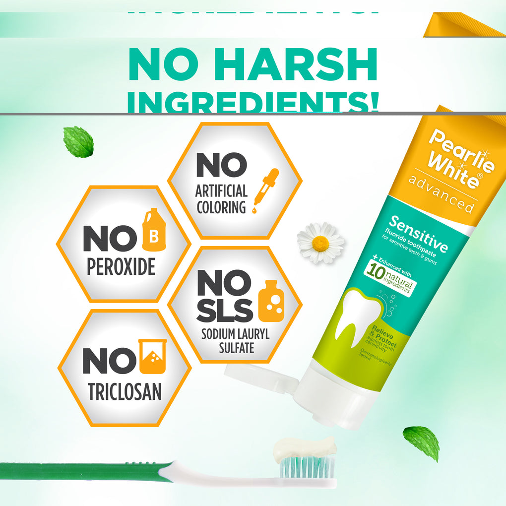 All Pearlie White® toothpastes do NOT contain SLS, Parabens, Triclosan, Titanium Dioxide, Artificial Coloring, Polyethylene Glycol (PEG), Propylene Glycol (PPG), Alcohol Diethylene Glycol (DEG), Mineral Oils, Retinol, Saccharin, Peroxide.