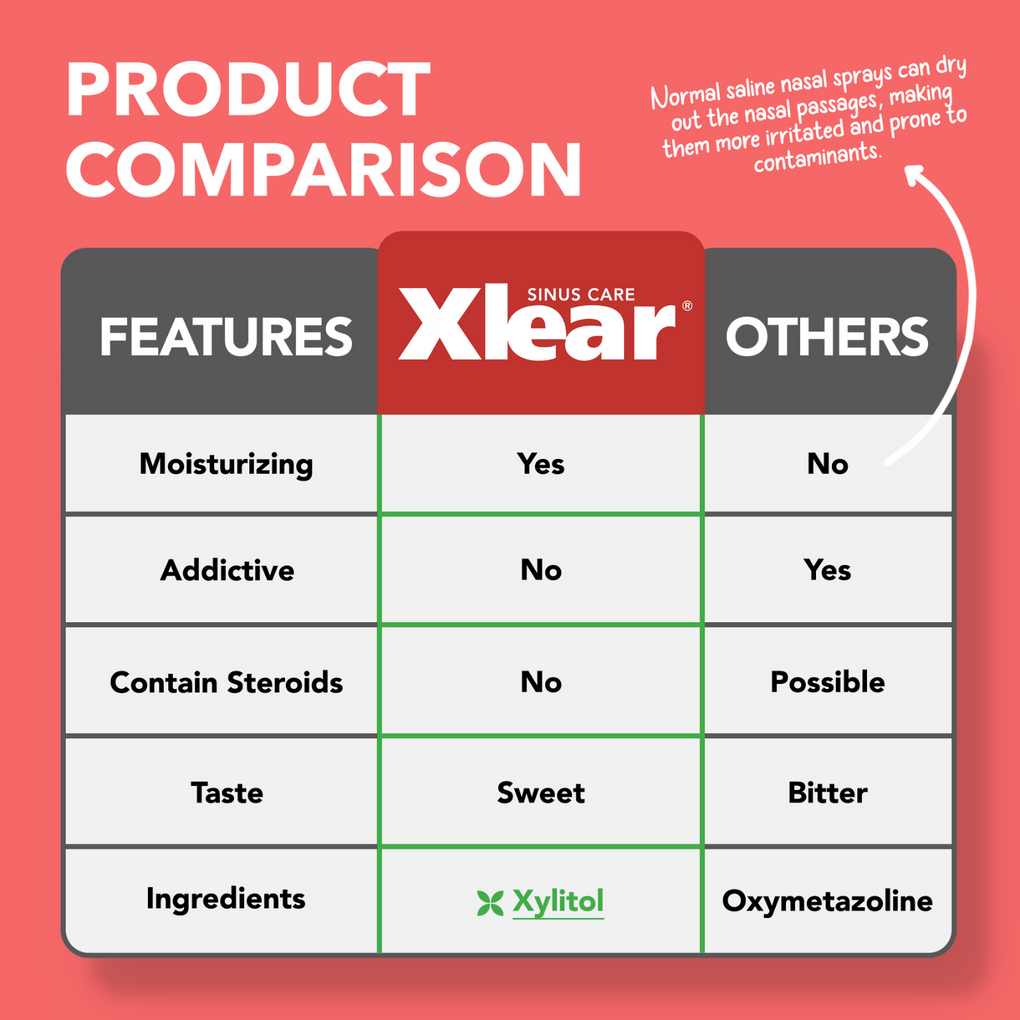 The XLEAR MAX saline nasal spray solution is a natural, non-addictive formula designed for occasional use. For regular daily cleansing, choose regular XLEAR Nasal Spray with Xylitol. Shake before use.