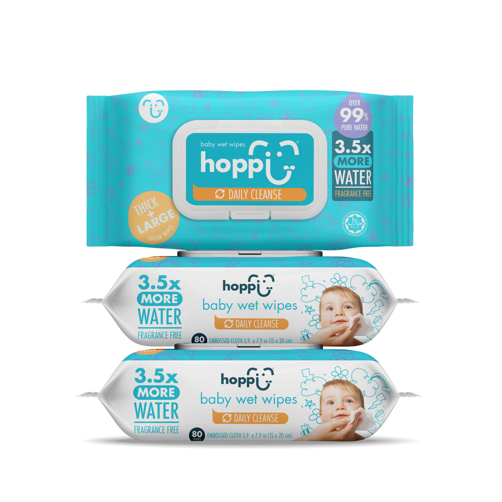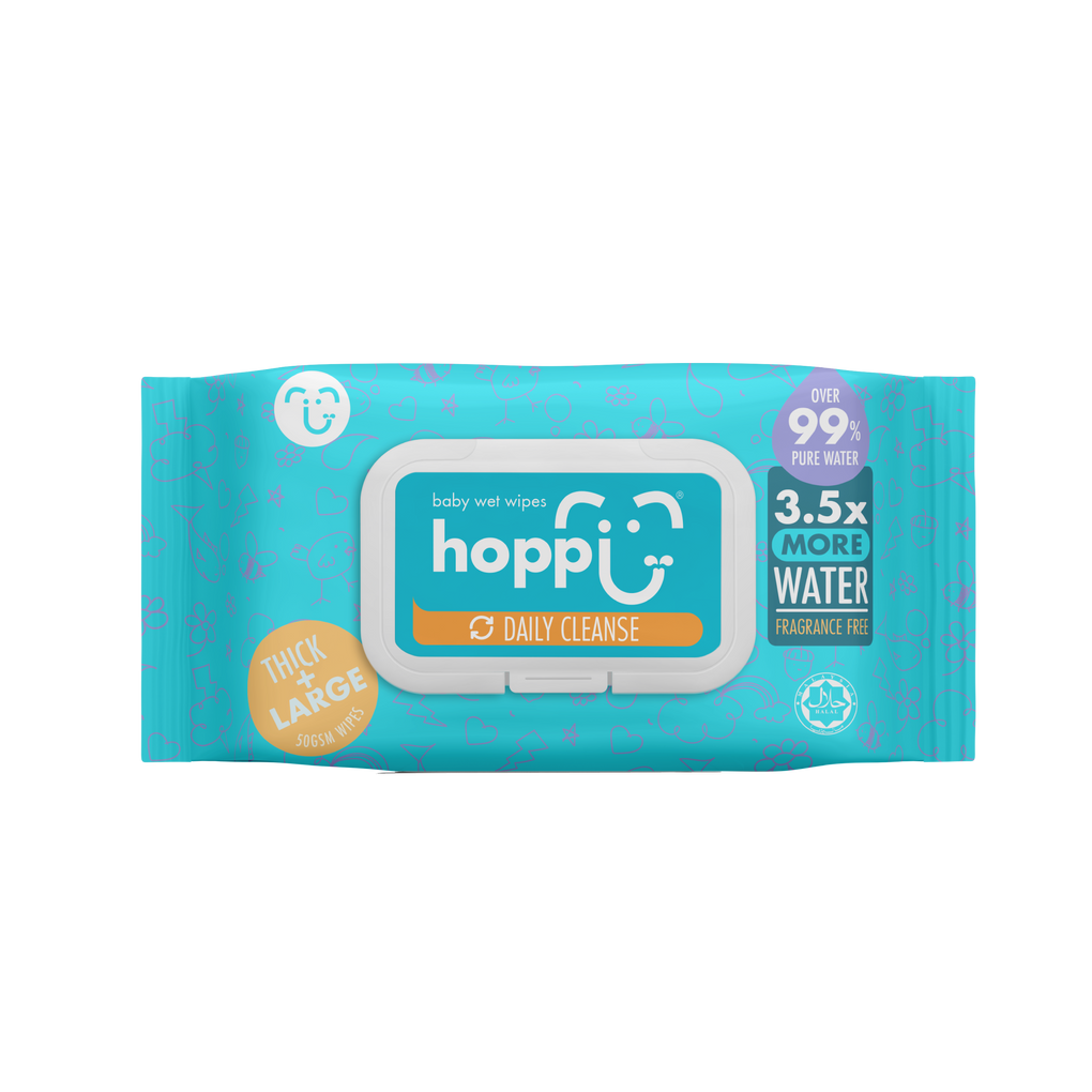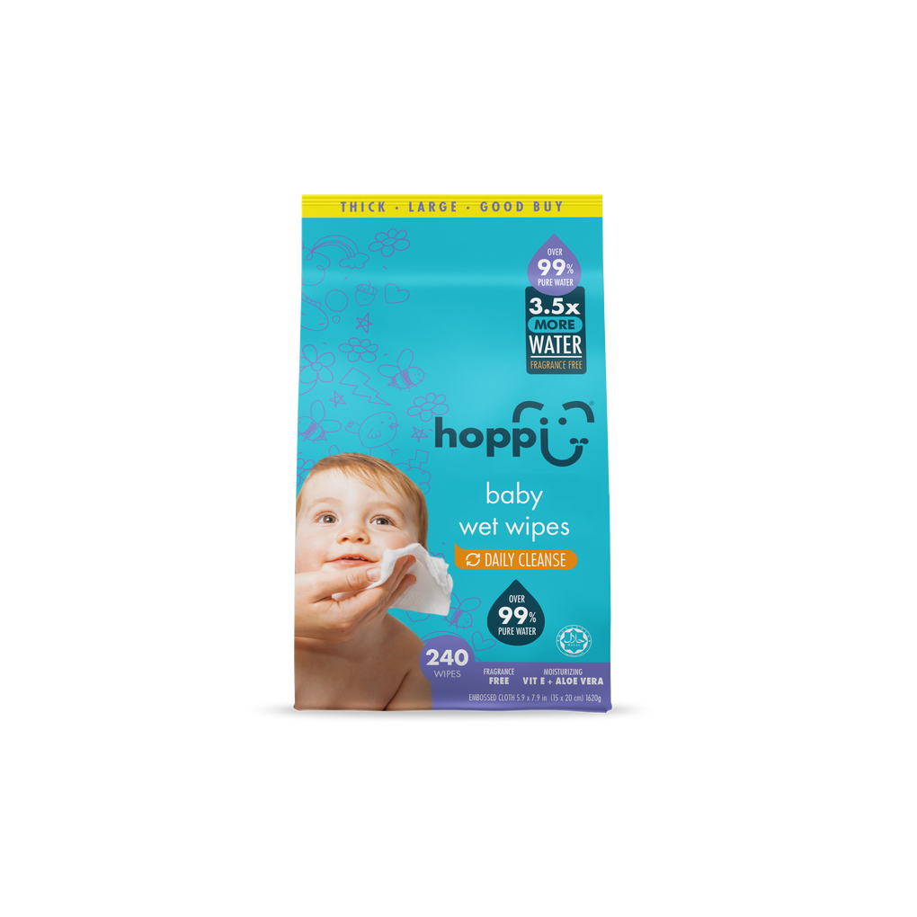 Hoppi™ Baby Wet Wipes is a 99% water wet wipes specially designed for the newborn & sensitive skin babies. It is softer, thicker, larger, and more durable than the average baby wet wipes in the market, while adhering to the highest international standards.