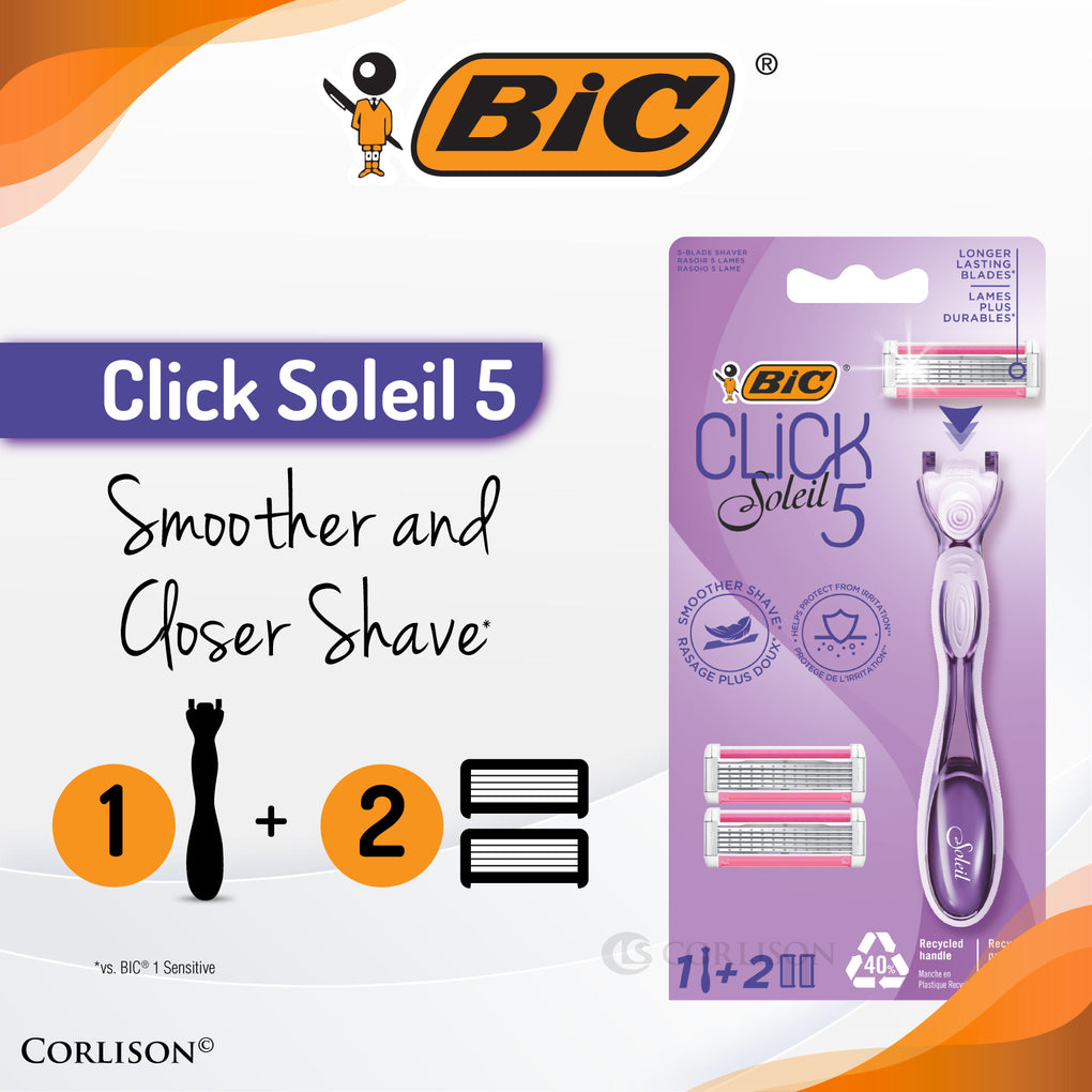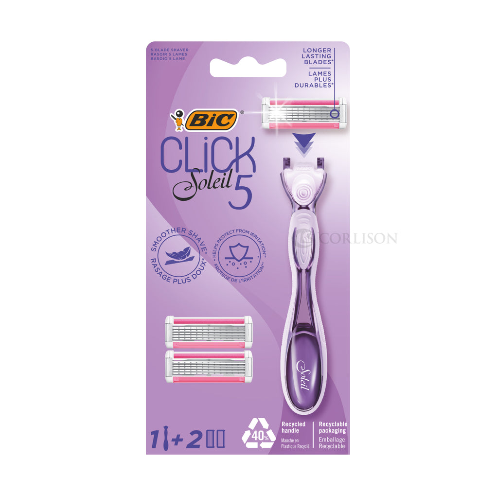 The BIC Click 5 Soleil kit contains 1 ergonomic handle made from 40% recycled material and 2 refillable cartridges. A pivoting head and rubber grip provide great control. The moisture strip is infused with Aloe Vera and Coconut Milk to help protect from irritation.