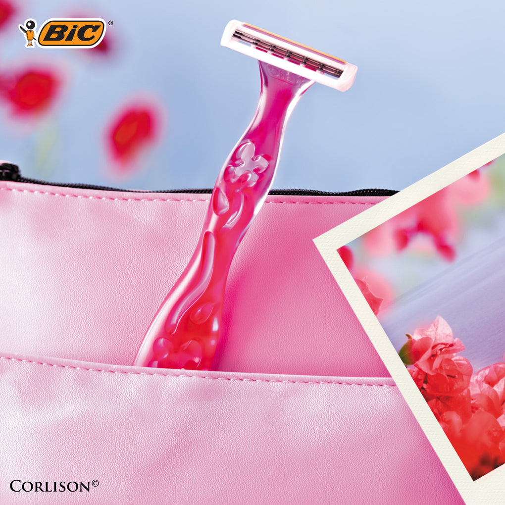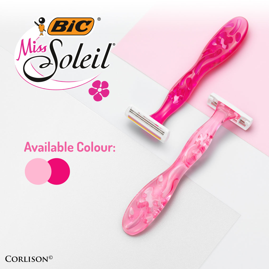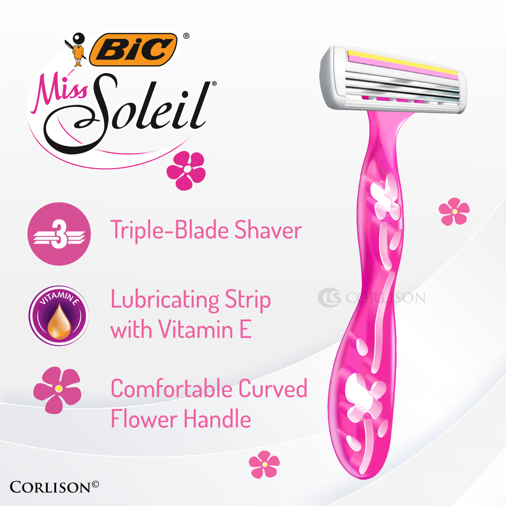 Make shaving a pleasure with this BIC Miss Soleil triple-blade razor distinctly designed for women with lovely engraved flowers on the handles in two shades of pink. Includes a lubricating strip enriched with Vitamin E for seamless glide and a smooth shave on legs, underarms, and the bikini area. A fixed head and three high-quality stainless steel blades for a close and smooth shave.