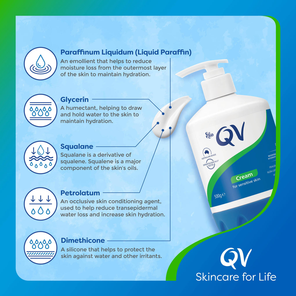 Highly concentrated moisturising cream for dry skin. It contains squalane, a natural component found in the skin’s oil. This rich protective cream replenishes the skin and dry areas. Areas prone to dryness like the elbows, knees and hands will just love what QV Cream can do to help.