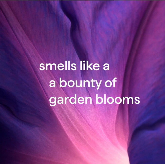 smells like a bounty of garden blooms with herbaceous notes of lavender + dewy violet leaves