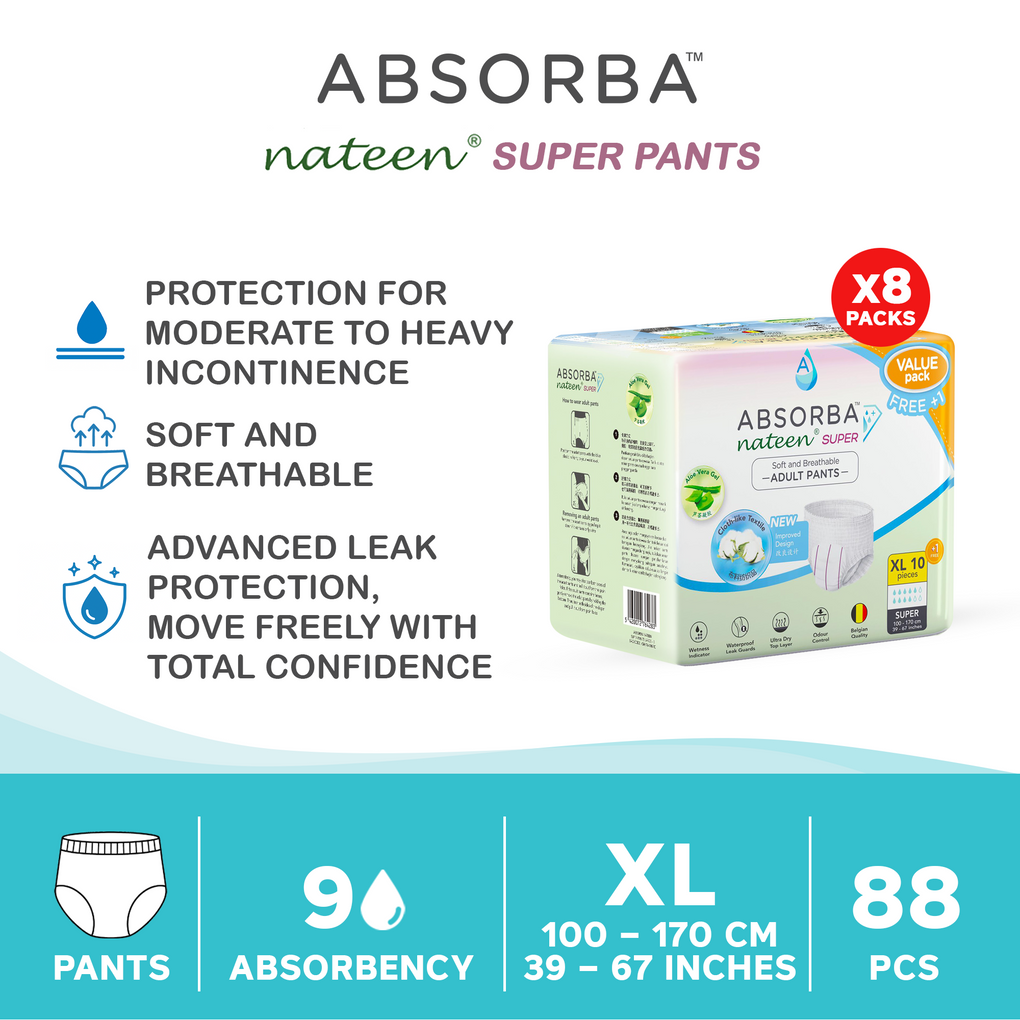 Absorba Nateen Adult Pants are premium Belgium-Quality incontinent pull up pants that provides you with multi-functional features and high absorbency performance.