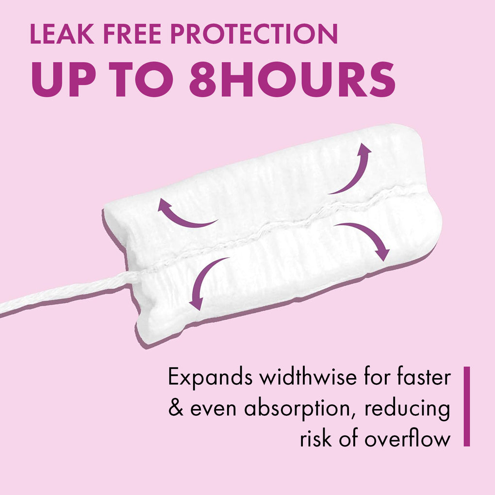 • Tampon features a leak locking technology and protective layer that prevents fibers from shedding